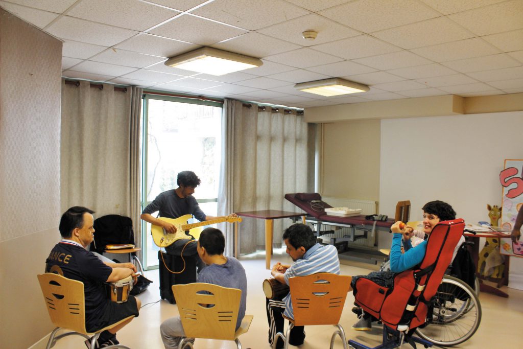 Une fois les présentations faites, il est temps pour l’atelier musique ! Une nouvelle activité qui plaît a tout le monde. Yann, le professeur de musique, installe sa guitare pendant que les participants prennent leur place dans la petite salle. Les yeux rivés sur les instruments, ils sont impatients de commencer. François est tout sourire lorsque Yann lui donne son tom de la batterie. Armé de ses baguettes, même si l’envie de commencer à jouer le ronge déjà de l’intérieur, il attend ses copains. Les voilà prêts : certains ont des tambourins, d’autres des maracas. En chef de chœur, Yann donne des consignes. « Tu commences à jouer tout doucement », dit-il à François. « À ton tour Maria ! », continue-t-il. Au début, ils ont un peu de mal à s’arrêter au bon moment. La joie de jouer d’un instrument est trop grande. Petit à petit, ils respectent les règles. Yann les observe en souriant. Ils ont fait tellement de progrès depuis qu’il est arrivé chez Perce-Neige, en septembre. Ils interagissent mieux entre eux et sont même synchros de temps à autre. Un vrai petit orchestre ! Il est temps de passer au chant. Et oui, mesdames et messieurs, les résidents chantent et ils le font d’une justesse… En voyant la guitare de Yann, François est tout content. Batteur né, il a le rythme dans la peau. « La la la lala lala… », fredonnent-ils en chœur. L’air de la chanson « I will survive », la musique bien connue de la Coupe du monde de 1998 dont les Français sont ressortis victorieux ! Dans son maillot bleu, François est prêt pour l’Euro 2016. « Et maintenant, nous allons nous souvenir de la chanson de Joe Dassin : Champs Elysées », propose Yann. Ils ont bien révisé, ils la connaissent par cœur. Même les accompagnants chantent avec les résidents ! Le temps d’euphorie générale laisse place à l’apprentissage d’une nouvelle chanson qui colle à la peau à tous les présents. « Notre vieille Terre est une étoile. Où toi aussi tu brilles un peu. Je viens te chanter la ballade. La ballade des gens heureux. Je viens te chanter la ballade. La ballade des gens heureux ! »